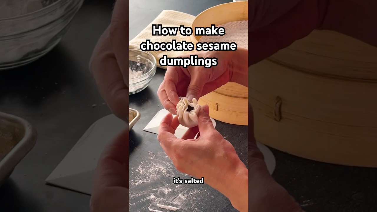 Chocolate Sesame dumplings these have a Sweet Mochi wrapper encasing a molten Chocolate filling it's almost like a Truffle it's salted and it has a hint of Toasted sesame oil to give it this great Savory sweet balance